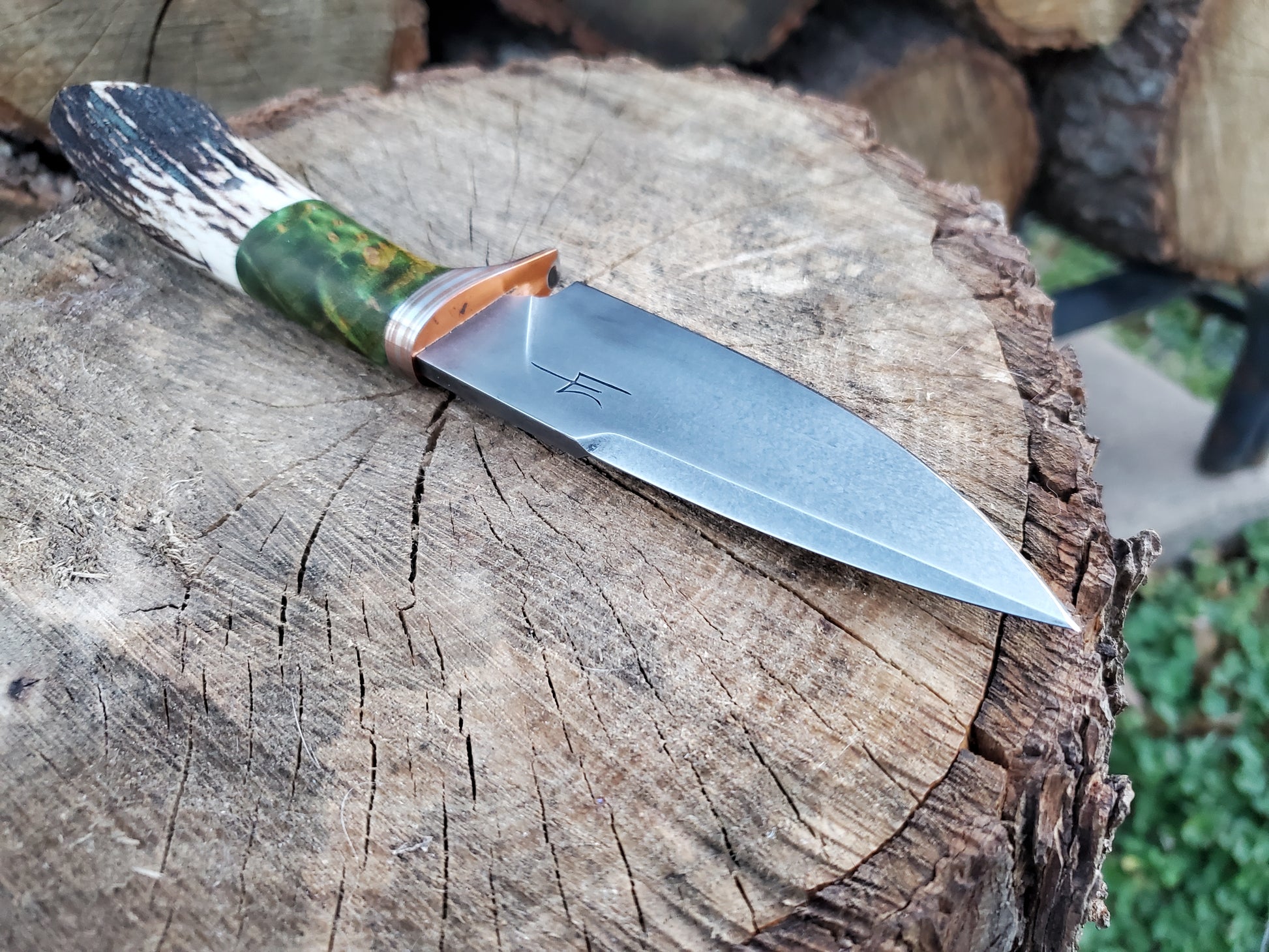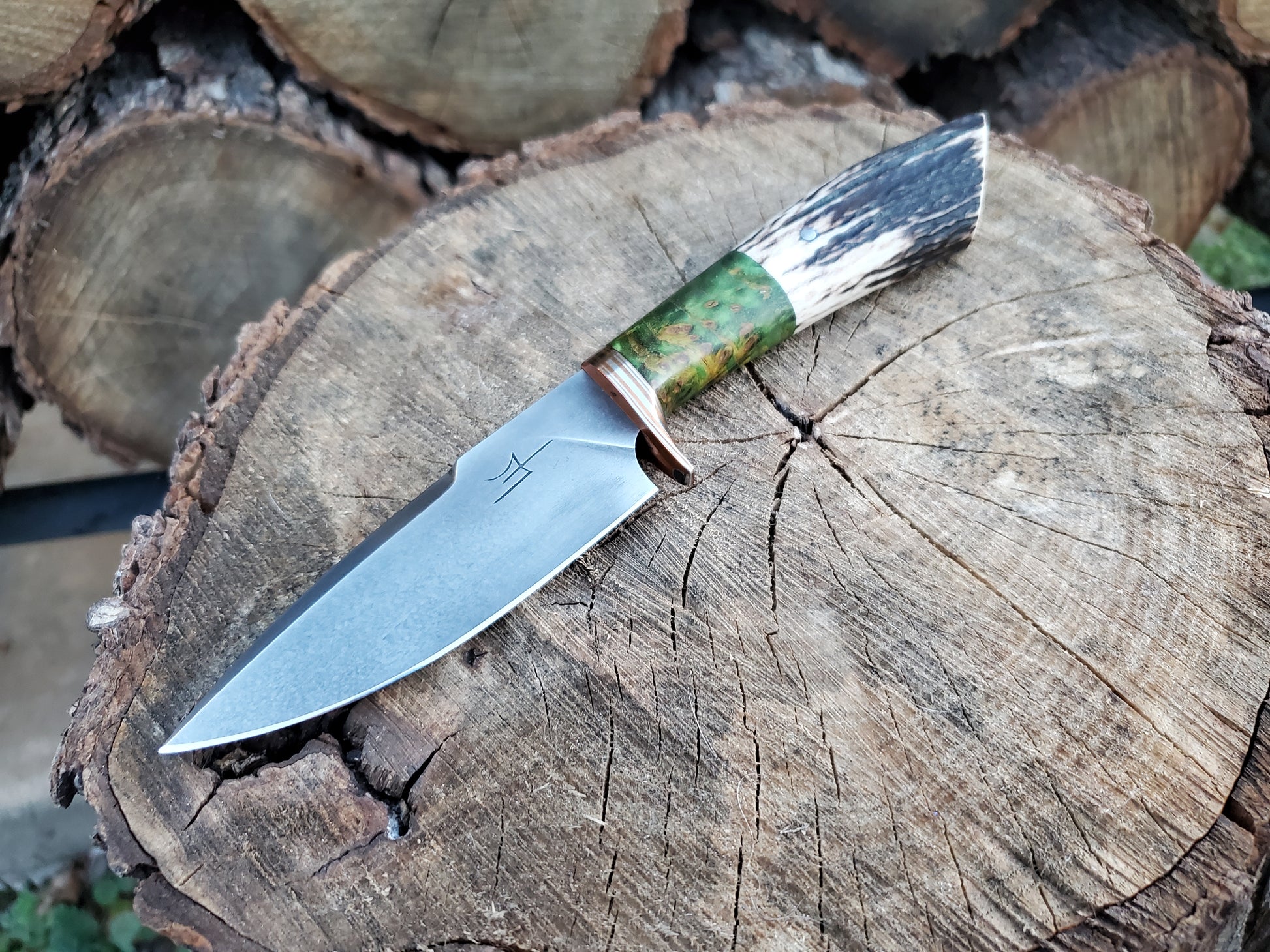 1084 Hidden Tang EDC with Antler Handle and Mokume-Gane Guard!