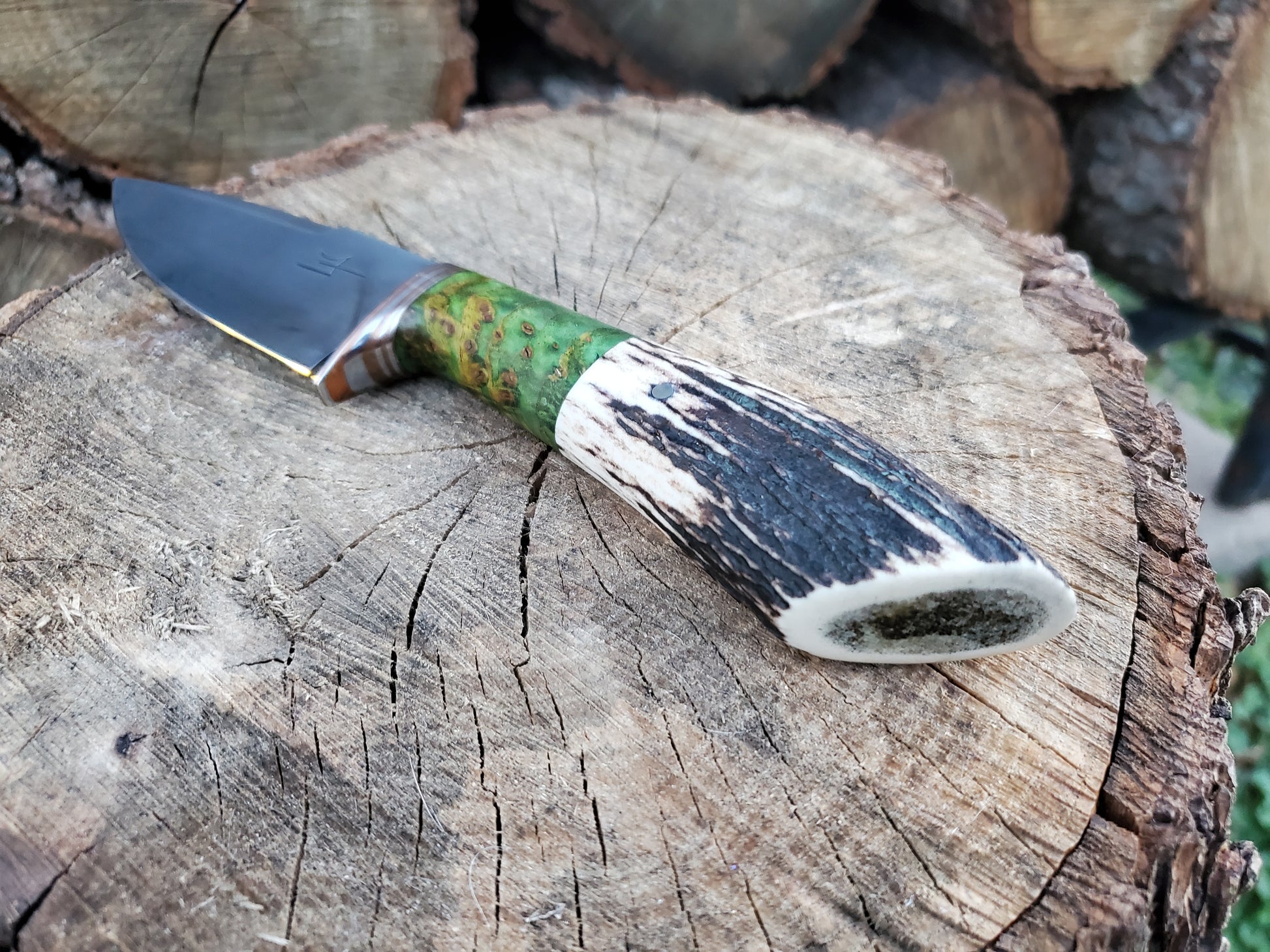 This is a beautiful Knife that I made on my YouTube channel. It has a 1084 Blade and an Antler Handle with a Mokume-Gane Guard that I made my self.