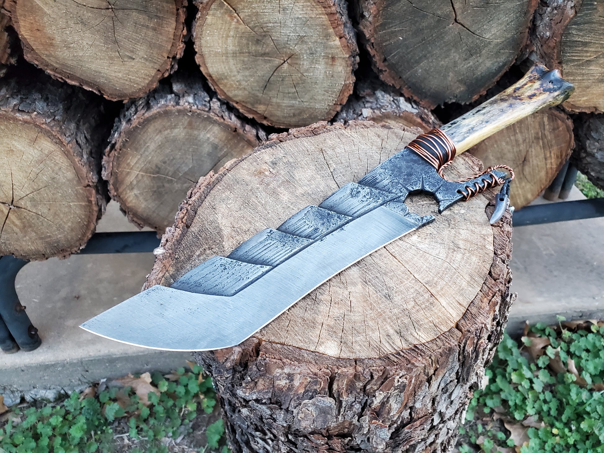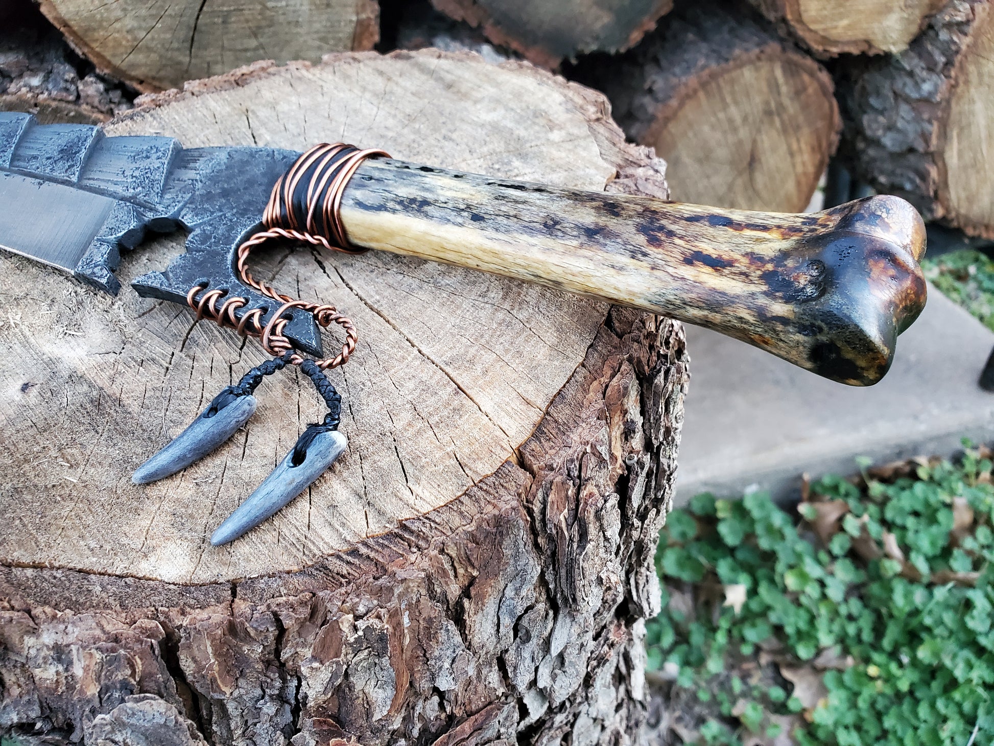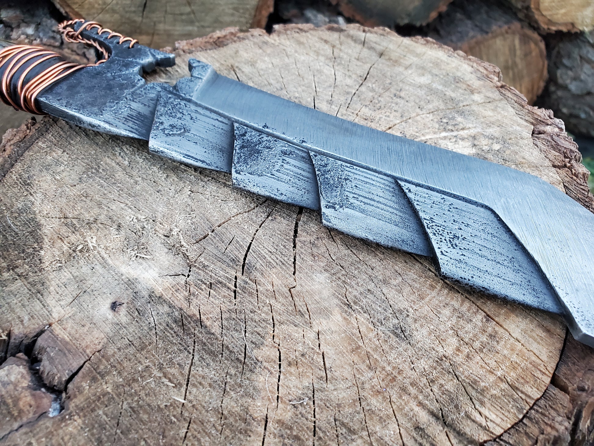 This Challenge build is one of the craziest knives I have ever made. I wanted it to have a World of Warcraft flare to it. The blade steel is 5160 and the handle material is Zebra bone. I have a full video on this build for the YouTube knife Maker's Challenge. The crazy part of this build was the hours of hand filing that went into the spine.